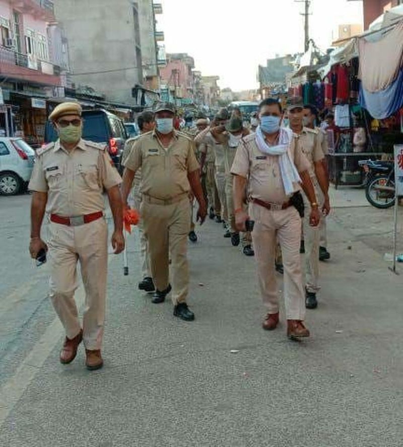 मेहंदीपुर बालाजी थाना क्षेत्र में निकाले गए फ्लैग मार्च में शामिल पुलिसकर्मी।