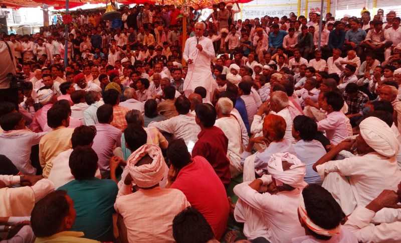 धरने पर बैठे लोगों को संबोधित करते पूर्व मंत्री परसादीलाल मीना।