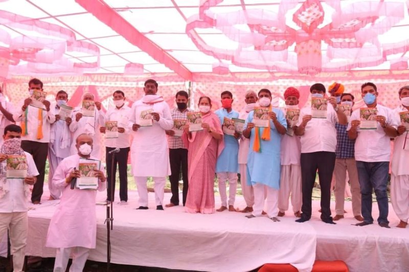 लालसोट के लाड़पुरा गांव में कृषि विधेयक पत्रक का विमोचन करती सांसद जसकौर मीना।