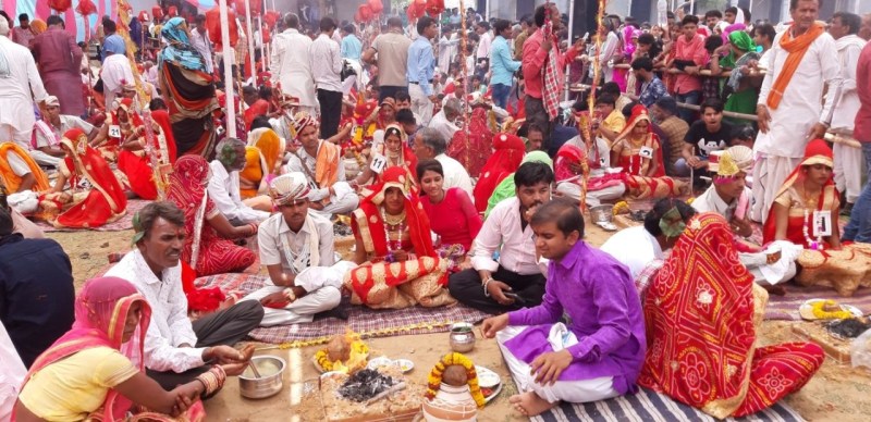 इससे पूर्व आयोजन की शुरुआत के मौके पर सुबह मंडप की रस्म अदा करने के बाद सभी दूल्हों की सामूहिक निकासी निकाली गई।इसमें युवक-युवतियों ने नाचते गाते शिरकत की। तोरण की रस्म के बाद मंच पर सभी नव युगलों ने अपने जीवन साथी के गले में वरमाला डाली।