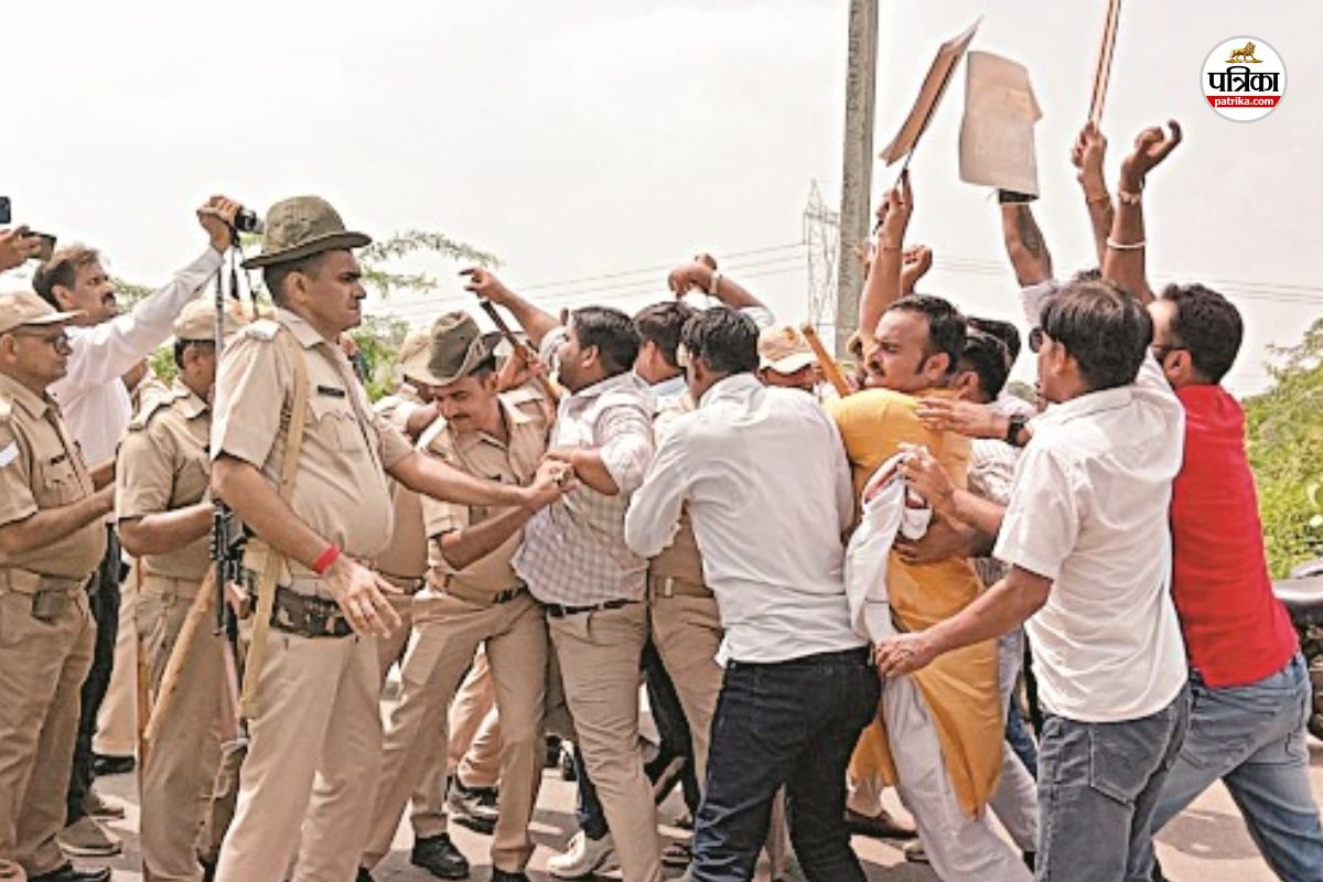 प्रदर्शनकारियों को रोकता पुलिस जाप्ता। फोटो: पत्रिका