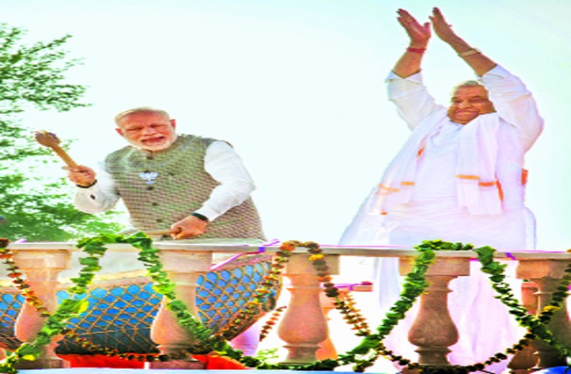 इससे पहले मोदी हेलीकॉप्टर से उतरकर मंच पर पहुंचे। किलेनुमा मंच के एक तरफ रखे ढोल-नगाड़ा को बजाकर कार्यक्रम का शंखनाद किया। बाद में डॉ. किरोड़ी ने भी नगाड़ा बजाया। प्रधानमंत्री बनने के बाद पहली बार दौसा आए नरेन्द्र मोदी ने सम्बोधन की शुरुआत ढूंढाड़ी भाषा में 'ईं दौसा में बिराजे भगवान मेहंदीपुर बालाजी और नीलकंठ महादेव को नरेन्द्र मोदी की ढोक’ से की। दौसा के बनेठा में तिरंगा के कपड़े बुनने को भी याद किया।