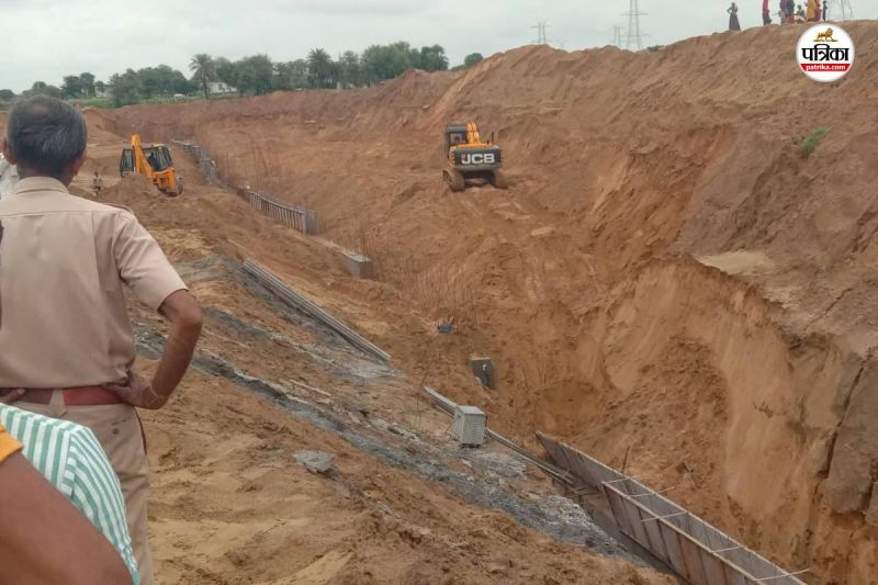 मिट्टी ढहने से दबे मजदूरों को बाहर निकालने के मिट्टी हटाती मशीनें। फोटो: पत्रिका