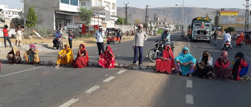 लालसोट की जगदंबा कॉलोनी के पास एनएच 11 ए पर बैठी महिलाएं।