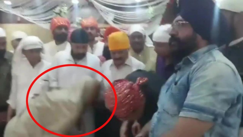 गुरुद्वारे में मंत्री वर्मा के पैर छूते कमिश्नर जैन। (लाल घेरे में)