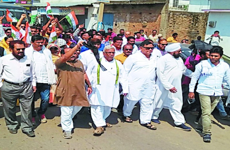 कांग्रेसी हाथों में काला झंडा और कपड़ा लहराते हुए चल रहे थे। प्रदर्शनकारी करीब सौ मीटर आगे बढ़े ही थे, कि एएसपी केपी चंदेल ने दलबल के साथ उन्हें रोक लिया। इस बीच पुलिस जवानों को धकियाते हुए वे आगे बढऩे की कोशिश करने लगे, लेकिन पुलिस की भारी घेराबंदी के चलते वे अपने प्रयास में सफल नहीं हो पाए।