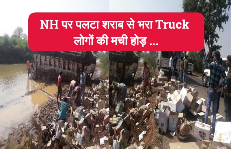 सड़क पर मची शराब की लूट, नेशनल हाइवे में पलटी अंग्रेजी शराब से भरी ट्रक