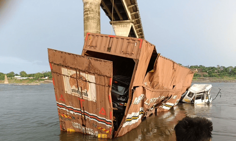 मंगलवार शाम को एक बड़ा हादसा हो गया। धार और खरगोन जिले की सीमा पर खलघाट नर्मदा ब्रिज से एक कंटेनर सड़क पर लहराते हुए सीधे नदी में जा गिरा। घटना के बाद यहां अफरा-तफरी मच गई। गोताखोर और पुलिस की मदद से कंटेनर के चालक को सुरक्षित बाहर निकाल लिया गया।