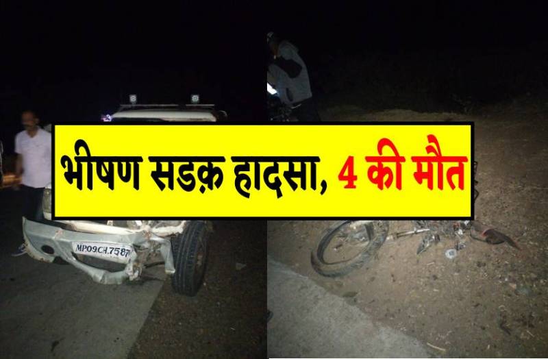 जानकारी के अनुसार मध्यप्रदेश के धार जिले में बुधवार देर शाम एक बाइक और बोलेरो कार में जोरदार भिड़ंत हो गई, जिससे दो बच्चों सहित चार लोगों की मौत हुई है, दुर्घटना होते ही मौके पर भारी संख्या में भीड़ लग गई, लोगों ने पुलिस की मदद से सभी के शवों को पीएम के लिए अस्पताल भेजा, जहां मृतकों का पीएम किया जाएगा।