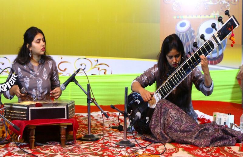 धार. सितारे और संतूर के तारों से झंकृत होती आवाज को जब रागों की माला में पिरोया जाता तो उसकी मधुरता और भी बढ़ जाती है। जब ये प्रस्तुतियां परिष्कृत हाथों द्वारा दी जाएं तो कहना ही क्या। उस पर सितार और संतूर का वादन साथ हो तो बात सोने पर सुहागे के समान हो जाती है। सितार और संतूर की जुगलबंदी के खूबसूरत नमूने प्रकृति वाहने और संस्कृति वाहने ने पेश किए। कभी एक-दूसरे का साथ देने की कोशिश तो कभी प्रतिद्वंद्वी की भांति अपने वादन से श्रोताओं का दिल जीत लेने का प्रयास आयोजन में रंग जमा रहा था। फडक़े संगीत समारोह समिति धार द्वारा आयोजित पद्मश्री फडक़े संगीत समारोह में शनिवार को उज्जैन की प्रकृति वाहने और संस्कृति वाहने ने प्रस्तुतियां दी। संतूर पर प्रकृति ने राग छेड़े तो सितार पर संस्कृति ने रंग जमाया।शनिवार को शासकीय उत्कृष्ट विद्यालय पद्श्री फडक़े संगीत समारोह में सितार और सूंतर की वह जुगलबंदी देखने को मिली जो की श्रोतागण कई दिनों तक अपने जहन में रखेंगे। यहां पर युवा सितार वादिका संस्कृति वाहने एवं संतूर वादिका प्रकृति वाहने ने अपनी जुगलबंदी प्रस्तुत की। इसमें वो राग यमन में आलाप, जोड़े, झाला, ताल झपताल में बंदिश तथा द्रुतलय तीन ताल में बंदिश पेश की। दोनों बहनों ने एक से बढक़र एक प्रस्तुति दी। दोनों बहनें अपने पिता लोकेश वाहने (प्राध्यपक, शासकीय स्नातक महाविद्यालय उज्जैन) की पुत्री व शिष्या है। संस्कृति और प्रकृति विश्वविख्यात सितारवादक डॉ शाहिद परवेज के सान्निध्य में इटावा घराने की बारीकियों की तालीम ले रही है। ताल योगी पंडि़त श्रुश तलवरकर से भी ताल का प्रशिक्षण व मार्गदर्शन प्राप्त कर रही है। दोनों बहन की जुगलबंदी में तबले पर संगत निशांत शर्मा ने दी।
