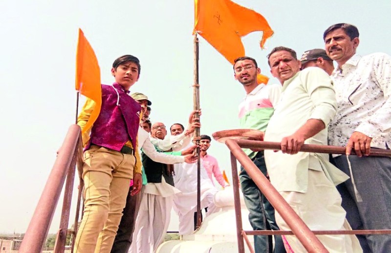मंदिरजी के शिखर पर ध्वजा दंड की अष्ट प्रकारी पूजा अर्चना कर दस दिगपाल की पूजा कर मंत्रोउच्चारण कर बाकुले उड़ाए गए।