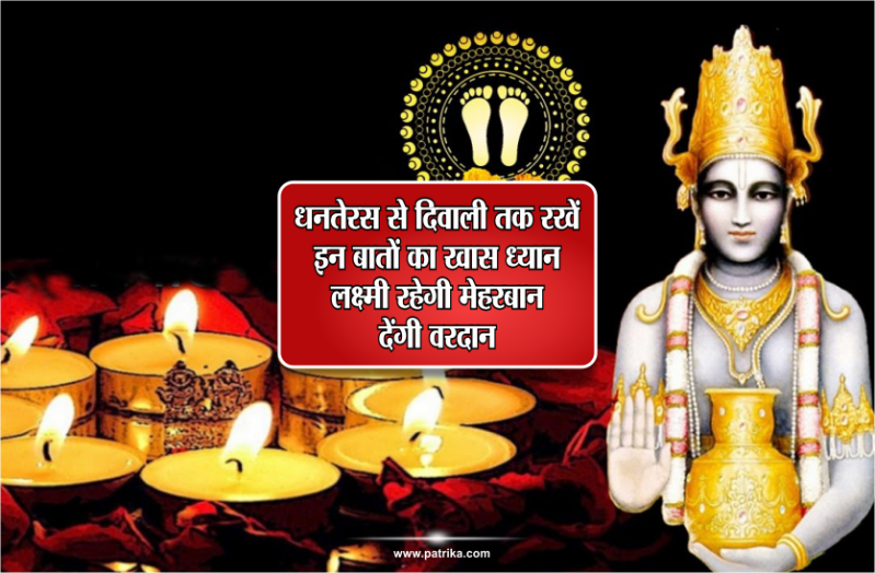 दिवाली पर लोग माता लक्ष्मी की पूजा-अर्चना करते हैं और उन्हें प्रसन्न करने के लिए कई कोशिशें करते हैं। हर व्यक्ति चाहता है की उसके घर में लक्ष्मी का वास हो लेकिन क्या आपको पता है हम बड़ी-बड़ी चीज़ों के बीच कहीं ना कहीं छोटी-छोटी चीज़ों को करना भूल जाते हैं। वैसे तो दिवाली का प्रमुख दिन अमावस्या के दिन होता है लेकिन इस महत्वपूर्ण दिन के दो दिन पहले से ही पूजा शुरु हो जाती है। यह त्यौहार धनतेरस के दन से शुरु हो जाता है। इस साल 5 नवंबर से धनतेरस के दिन से पूजा-पाठ व पर्व शुरु हो जाएगा और भाई दूज तक चलेगा। इस समय लोग अपने घरों में साफ-सफाई भी करते हैं और उसे अच्छी तरह से सजाते हैं, क्योंकि दिवाली के दिन लक्ष्मी जी घर में आती हैं और देवी लक्ष्मी को सफाई बहुत पसंद हैं। इसके अलावा लोग अपनी आर्थिक परेशानियों से छुटकारा पाने के लिए कई तरह के उपाय करते हैं। इन्हीं के बीच कुछ ऐसी विशेष बाते हैं जिनका हमें विशेष ध्यान रखना चाहिए। आइए जानते हैं कौन सी है वो विशेष बातें जिनका धनतेरस से दीपावली तक हमें ध्यान रखना चाहिए...