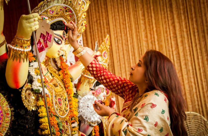 देवी दुर्गा को स्थापित करने के लिए एक चौकी लाएं और उस लाल या पीले रंग का कपड़ा बिछा दें। इसके बाद उस पर माता रानी की तस्वीर या मूर्ति रख दें। इसके बाद मां को टीका लगाएं और श्रृंगार का सभी सामान अर्पित कर दें।