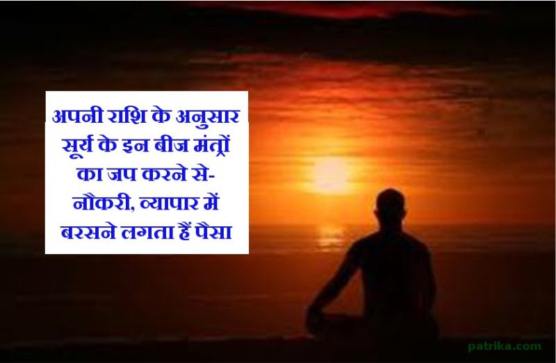 सूर्य भगवान को सभी देव शक्तियों की ऊर्जा का स्रोत कहा जाता हैं, एवं सूर्य सभी नवग्रहों के अधिपति, सौरमंडल के स्वामी भी सूर्य ही माने जाते हैं, 27 नक्षत्रों सहित सभी बारह राशियों के स्वामी भी सूर्य हैं । ज्योतिषाचार्य पं. अरविंद तिवारी ने पत्रिका डॉट कॉम को बताया की सभी बारह राशियों के जो कोई भी जातक अपनी राशि के अनुसार सूर्य के इन बीज मंत्रों का जप रविवार के दिन या प्रतिदिन सूर्योदय के समय केवल 108 बार जप करता हैं उसके जीवन में जीवन भर पैसों की कमी नहीं रहती, उनकी नौकरी में तरक्की होने के साथ उनके व्यापार में धन में तेज वृद्धि होने लगती हैं ।