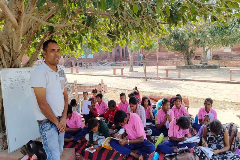 धौलपुर. मचकुण्ड पर बरगद पेड़ के नीचे पढ़ा रहे शिक्षक नरेन्द्र।