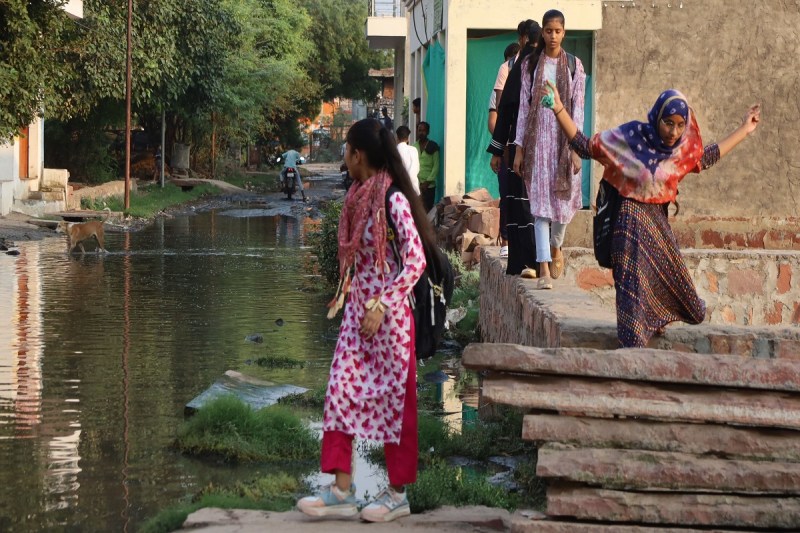 धौलपुर. पटपरा रोड पर सीवरेज का पानी भरा होने से बमुश्किल रास्ता पार करती छात्राएं।