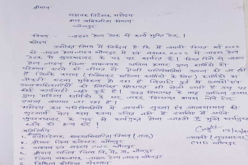 महिला कार्मिक गायत्री ने बताया कि वह नवंबर 2023 से रेलवे स्टेशन स्थित चाइल्ड हेल्प डेस्क में सुपरवाइजर के पद पर कार्यरत है। लेकिन वह काम जिला कलक्ट्रेट में करती थी और काम होने पर स्टेशन पहुंच जाती थी। आरोप है कि वर्तमान में जिला समन्वयक अनिल कुमार के पद का कथित दुरुपयोग कर महिला कार्मिकों को परेशान किया जा रहा था। जिसकी शिकायत कुछ दिन पूर्व जिला कलक्टर एवं सहायक निदेशक बाल अधिकारिता विभाग को भी की गई थी लेकिन अभी तक कोई सुनवाई नहीं हुई। आरोप है कि जिला समन्वयक कार्मिकों के घर जाकर शिकायत वापस लेने का दवाब बना रहे हैं। जिससे काम करना मुश्किल हो गया है। गायत्री ने मेल में बताया कि उन्होंने सुरक्षा एवं आत्मसम्मान की रक्षा के लिए त्यागपत्र उच्च अधिकारियों को भेज दिया है। आरोप लगाया कि कुछ समय पहले बिना विभागीय अधिकारी की अनुमति के रेलवे स्टेशन पर कार्य कर रही टीम को जिले में शिफ्ट कर दिया और जिले की टीम को स्टेशन पर शिफ्ट कर दिया गया। जिससे सभी को परेशानी उठानी पड़ी।