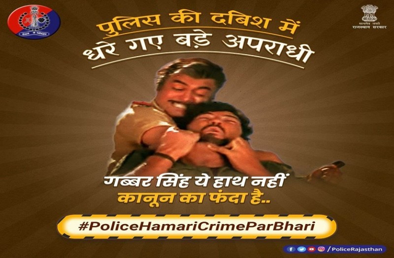 राजस्थान पुलिस केवल कार्रवाईयों को लेकर ही पोस्ट व संदेश नहीं भेज रही बल्कि सोशल मीडिया टीम तीज-त्योहारों पर पर भी लगातार पोस्ट करती है। इसमें होली, दिवाली, न्यू ईयर, फ्रेंडशिप डे, गणगौर, ईद इत्यादि त्योहार शामिल हैं। राजस्थान की सोशल मीडिया पर चलाई जा रही मुहिम में संदेश आमजन का खासा ध्यान खींच रहे हैं। इसमें पंच लाइन, शायरी, डायलॉग, फिल्मी गीतों के माध्यम से अपनी बात रख रहे हैं। ट्विटर पर शोले फिल्म का फेमस डायलॉग ‘गब्बर सिंह ये हाथ नहीं, कानून का फंदा है’। इसी तरह एक अन्य पोस्ट में बॉलीवुड की रईस फिल्म के किरदार को बताते हुए ‘अपराधियों का जेल ही है अंजाम’ पंचलाइन लिखी है।