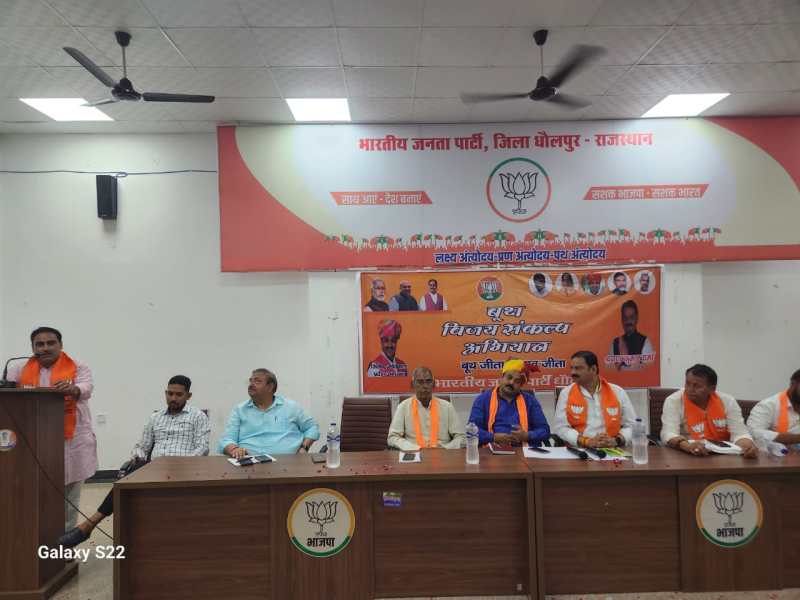 धौलपुर. भारतीय जनता पार्टी का विधानसभा का बूथ विजय संकल्प कार्यक्रम शुक्रवार को जिला कार्यालय पर आयोजित किया गया। जिला कार्यालय पर मुख्य अतिथि प्रदेश उपाध्यक्ष जितेंद्र गोठवाल एवं विशिष्ट अतिथि जिला अध्यक्ष भाजपा श्रवण कुमार वर्मा, विस्तारक संभाग प्रभारी राजवीर सिंह राजावत, प्रदेश कार्यकारिणी सदस्य विशंभरदयाल शर्मा, धौलपुर विधानसभा संयोजक जितेंद्र सिंह राजोरिया, हरिनिवास प्रधान एवं धौलपुर विधानसभा विस्तारक पवन चौधरी के मुख्य अतिथि में हुआ। कार्यक्रम की शुरुआत भारत माता के चित्र पर माल्यार्पण कर की गई एवं वंदे मातरम का गायन किया गया। कार्यक्रम में प्रदेश उपाध्यक्ष जितेंद्र गोठवाल ने कहा कि बूथ विजय संकल्प अभियान से हम राजस्थान विजय करने के लिए निकले हैं। मोदी सरकार के कार्यकाल के उत्तम 9 वर्ष एवं अशोक गहलोत की कांग्रेस सरकार कार्यकाल के कलंकित 5 वर्ष ही हमें राजस्थान विजय की ओर ले जा रहे हैं। भाजपा का शीर्ष नेतृत्व देश को एक नई दिशा देने में लगा है राष्ट्रीय और प्रादेशिक मुद्दों के अलावा अपने-अपने बूथ स्तर के मुद्दों पर विशेष ध्यान देना होगा। आज देश और प्रदेश की राजनीति का केंद्र बिंदु बूथ हो गया है। कार्यक्रम को विशंभर दयाल शर्मा, राजवीर सिंह राजावत समेत अन्य ने भी संबोधित किया। संचालन विजय त्यागी ने किया। धौलपुर विधानसभा के भूत संकल्प कार्यक्रम में जिले के समस्त पदाधिकारी एवं सैकड़ों कार्यकर्ता उपस्थित रहे।