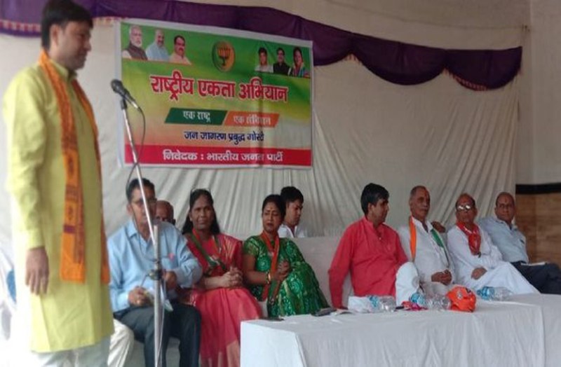 धौलपुर. धारा 370 व 35ए हटाने के उपलक्ष्य में भाजपा की ओर से शुक्रवार को राष्ट्रीय एकता अभियान ‘एक राष्ट्र-एक संविधान’ जनजागरण प्रबुद्ध गोष्ठी का आयोजन एक कॉम्प्लेक्स में हुआ। मुख्य अतिथि युवा विकास बोर्ड के पूर्व अध्यक्ष भूपेंद्र सैनी, जनजागरण अभियान की संभाग प्रभारी ऋतु बनावत व ऋषि बंसल रहे।