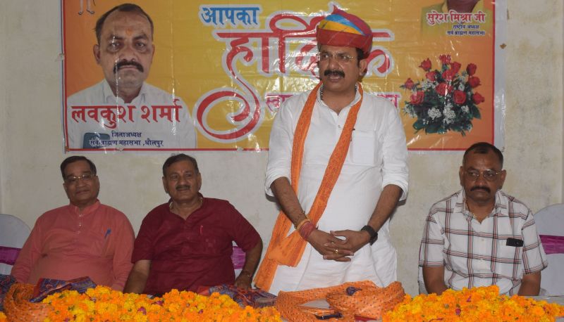 मिश्रा ने बताया कि राज्य में लगभग 70 सीटों को ब्राह्मण प्रभावित करते हैं इसलिए राजनीतिक पार्टी कोई भी हो राज्य में कम से कम 35 सीटें ब्राह्मणों को दी जानी चाहिए। वहीं सर्व ब्राह्मण महासभा के जिला अध्यक्ष लवकुश शर्मा व प्रिंस हुंडावाल, अनुराग मुदगल ने राष्ट्रीय अध्यक्ष को परशुराम भगवान का प्रतीक चिन्ह भेंट किया। इस मौके पर राकेश, भगवान शर्मा, ऋषिकेश भारद्वाज, केशव देव मलहरा, राजवीर, सतीश वैद्य, उमेश शर्मा, राकेश शर्मा, राम शर्मा, मोहन शर्मा, विशंभर दयाल शर्मा, राजेश तिवारी, रिंकू बोहरे आदि लोग उपस्थित रहे।
