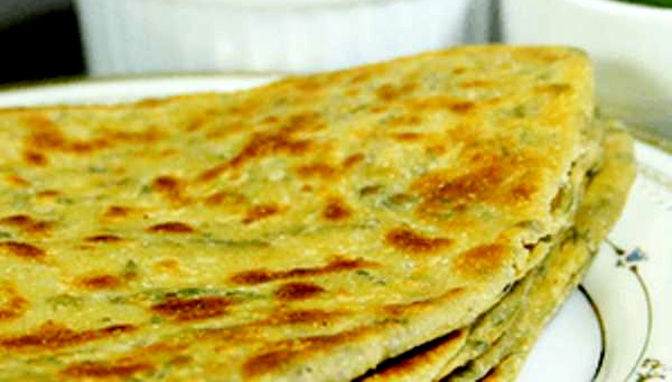 ऐसे बनाएं : डोंगे में गेहूं का आटा, बेसन, तेल, नमक, लाल मिर्च, हल्दी, जीरा, हींग और हरा धनियां डालकर अच्छी तरह मिला लें। आटा गूंथ कर तैयार कर लें। गुंथे आटे को ढंककर आधा घंटे के लिए रख दें। तवे को गरम कर लें। एक नीबू से थोड़ा अधिक तोड़ कर लोई बना लें। लोई को सूखे गेहूं के आटे में लपेट कर चकले पर 3 इंच के व्यास में बेल कर तैयार करें। बेले हुए परांठे के ऊपर थोड़ा सा तेल डाल कर चारों ओर फैलाएं। चारों ओर से आटे को उठाते हुए बन्द करें। जो गोल लोई बन कर तैयार हो गई है, उसे सूखे आटे में लपेट कर बेलें। जैसे ही परांठा चकले से चिपकने लगे, बेले गये परांठे को फिर से सूखे आटे में लपेट कर, पतला परांठा बेल कर तैयार करें। बेले हुए परांठे को मीडियम आंच पर दोनों तरफ हल्की ब्राउन चित्ती होने तक सेंकें। सिंके हुए परांठे को किसी प्लेट पर रखी प्याली पर रख लीजिए। इसको तिकोना भी बना सकते हैं।