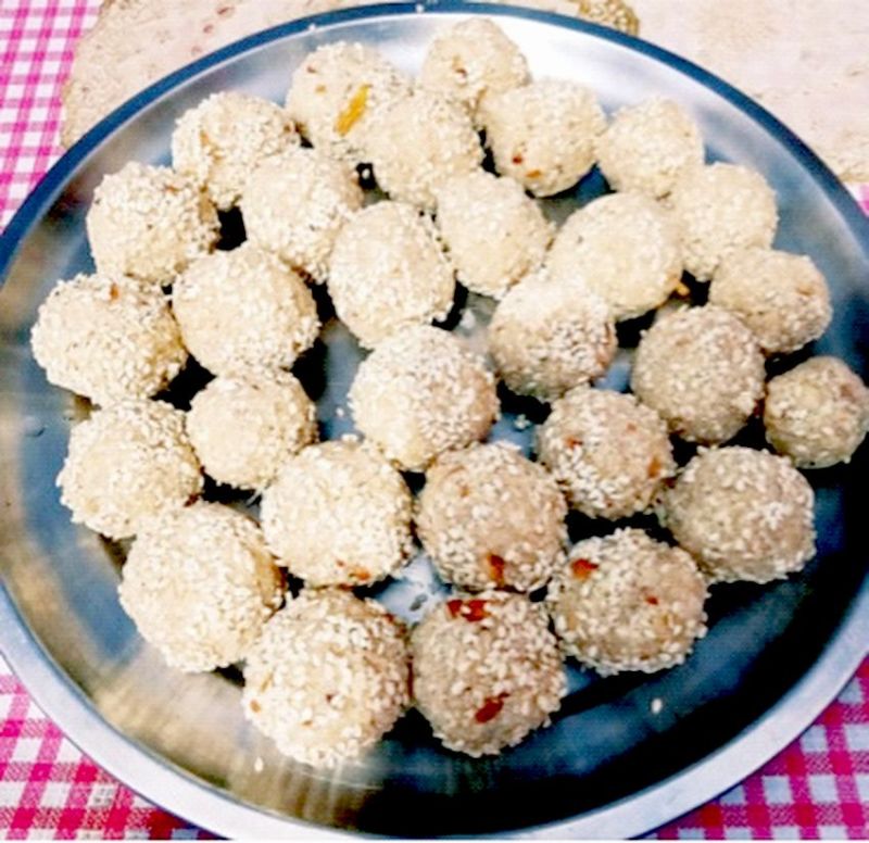 ऐसे बनाएं : तिल और मूंगफली को धीमी आंच पर बिना घी अलग-अलग सुनहरा होने तक भुनें। अब मूंगफली के छिलके उतारकर उसे दरदरा पीस लें। बादाम भी दरदरा पीस लें। भुने तिल में से थोड़ा सा निकालकर दरदरा पीसें। एक कड़ाही में घी गरम कर बादाम पहले डालें फिर मूंगफली और तिल। इस मिश्रण को अच्छी तरह से मिलाकर गैस बंद कर दें। मिश्रण हल्का गर्म रह जाए तब चीनी व इलायची पाउडर मिलाएं। फिर इसमें मलाई मिलाएं। अब हाथ पर पानी लगाकर लड्डू बनाएं। लड्डुओं को साबूत भुने हुए तिल में लपेटें।