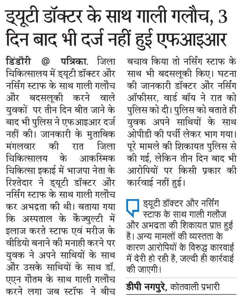 डिंडौरी. जिला चिकित्सालय में विगत दिनों ड्यूटी डॉक्टर और नर्सिंग स्टाफ के साथ गाली-गलौज कर जान से मारने की धमकी मामले में आठ दिन बाद पुलिस ने मामला दर्ज किया है। जानकारी के अनुसार कलेक्टर के हस्तक्षेप के बाद कोतवाली में पूर्व मंडल अध्यक्ष के भतीजे के विरुद्ध एफआईआर दर्ज की गई। पुलिस ने चिकित्सक की शिकायत पर आरोपी रामेश्वर राठौर के विरुद्ध शासकीय कार्य में बाधा सहित अन्य धाराओं के तहत प्रकरण कायम कर विवेचना में लिया है। गौरतलब है कि बीते सप्ताह रात लगभग ढाई बजे जिला चिकित्सालय के आकस्मिक चिकित्सा ईकाई में रामेश्वर राठौर खांसी की शिकायत लेकर पहुंचा था। उसके साथ अन्य लोग भी थे । आरोप है कि सभी शराब के नशे में थे। शिकायत में बताया गया कि इस दौरान चिकित्सीय अमला एक मरणासन मरीज के इलाज में जुटा था। जबकि राजेश्वर और उसके साथी मोबाइल से वीडियो बना रहे थे। कैज्युल्टी में इलाज करते स्टाफ एवं मरीज के वीडियो बनाने की मनाही पर रामेश्वर राठौर और उसके साथियों ने डॉ एएन. गौतम के साथ गाली-गलौच कर दी । इसके साथ ही नर्सिंग स्टाफ के साथ भी बदसलूकी को अंजाम दिया। इस बाबद ड्यूटी डॉक्टर और नर्सिंग ऑफीसर, वार्ड बाय ने रात में ही पुलिस को लिखित शिकायत की थी, लेकिन आठ दिन बाद भी पुलिस ने मामला दर्ज नहीं किया। गत दिवस सिविल सर्जन के साथ अन्य चिकित्सकों ने कलेक्टर से मिलकर कार्रवाई की मांग की, इसके बाद कलेक्टर नेहा मारव्या ने कोतवाली प्रभारी को एफआईआर दर्ज करने के निर्देशित किया।