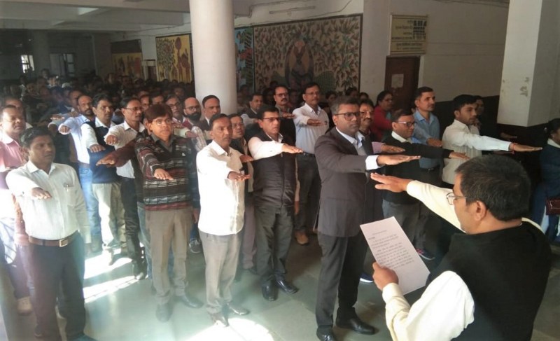 डिंडोरी. कलेक्टर बी. कार्तिकेयन सहित समस्त अधिकारी कर्मचारियों ने मंगलवार को कलेक्ट्रेट परिसर में संविधान दिवस की शपथ ली। इस अवसर पर संयुक्त कलेक्टर रमेश सिंह ने शपथ दिलाई कि हम भारत के लोग, भारत को एक, संपूर्ण प्रभुत्व संपन्न समाजवादी पंथ निरपेक्ष लोकतंत्रात्मक गणराज्य बनाने के लिए, तथा उसके समस्त नागरिकों को सामाजिक, आर्थिक और राजनीतिक न्याय, विचार, अभिव्यक्ति विश्वास धर्म और उपासना की स्वतंत्रता, प्रतिष्ठा और अवसर की समता, प्राप्त कराने के लिए, तथा उन सब में व्यक्ति की गरिमा और राष्ट्र की एकता और अखण्डता, सुनिश्चित करने वाली बन्धुता बढ़ाने के लिए दढ़ संकल्प होकर अपनी इस संविधान सभा में आज तारीख 26 नवम्बर 1949 ई. को एतद् द्वारा इस संविधान को अंगीकृत, अधिनियमित और आत्मार्पित करते हैं। इस अवसर पर डिप्टी कलेक्टर रजनी वर्मा, सहायक आयुक्त आदिवासी विकास विभाग डॉ. अमर सिंह उईके, जिला समन्वयक सर्व शिक्षा अभियान राघवेन्द्र मिश्रा सहित विभागीय अधिकारी कर्मचारियों ने संविधान दिवस की शपथ ली। इसके अलावा कार्यपालन यंत्री एमपीईबी कार्यालय में संविधान दिवस के अवसर पर सभी अधिकारी कर्मचारियों ने संविधान दिवस पर उक्त शपथ ली। इस अवसर पर विद्युत विभाग के अधिकारी कर्मचारी मौजूद थे। वहीं तहसीलदार करंजिया चंद्रशेखर मिश्रा सहित सभी अधिकारी कर्मचारियों ने तहसील कार्यालय करंजिया में संविधान दिवस के अवसर पर शपथ ली। इस अवसर पर तहसील स्तरीय अधिकारी कर्मचारी मौजूद थे।