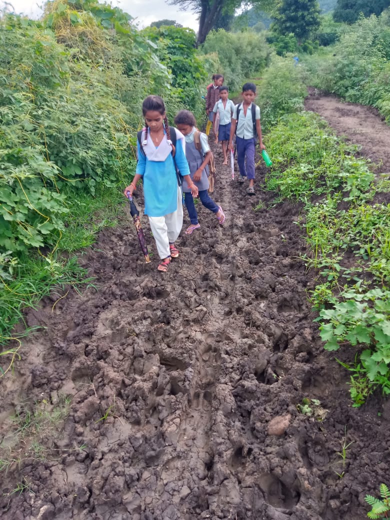 कच्ची सड़क से आवागमन करते हैं स्कूली बच्चे
