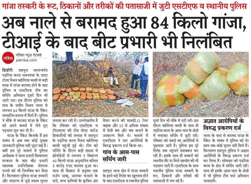 डिंडौरी. शहपुरा थांनांतर्गत पड़रिया गांव में तीसरे दिन भी सर्चिंग अभियान चलाया गया। इसी दौरान पुलिस अधीक्षक, अतिरिक्त पुलिस अधीक्षक तथा एसडीओपी शहपुरा व डिंडौरी ने पांच सदस्यीय अलग-अलग टीम बनाकर पड़रिया कला के साथ आस-पास के क्षेत्र में सघन सर्चिंग की। साथ ही संदिग्धों से पूछताछ भी की गई। हालांकि इस दौरान पुलिस के हाथ कुछ भी नहीं लगा और टीम को बैरंग लौटना पड़ा। उल्लेखनीय है कि एक ही क्षेत्र में 10 क्विंटल से ज्यादा गांजा की खेप बरामद होने के बाद पुलिस इस क्षेत्र में लगातार नजर बनाए हुए है। मामले में चार आरोपियों को हिरासत में लिया गया है वहीं अन्य आरोपियों की पतासाजी व सुराग के लिए लगातार पुलिस क्षेत्र में दबिश व सर्चिंग कर रही है। फिलहाल पुलिस गांजा तस्करी और भंडारण से जुड़े तमाम सुराग तलाश रही है।