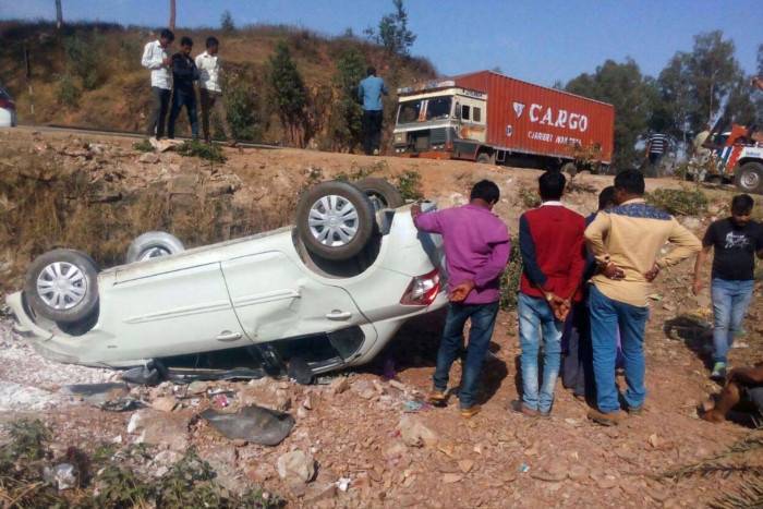 राष्ट्रीय राजमार्ग संख्या आठ पर बुधवार शाम घोघा मोड़ के निकट कार अनियंत्रित होकर पलट गई। इससे कार सवार एक ही परिवार के उदयपुर निवासी फतेहलाल (55) पुत्र कन्हैयालाल, मंशा (50) पत्नी फतेहलाल, संदीप (35) पुत्र चंद्रप्रकाश तथा सुमित (25) पुत्र फतेहलाल घायल हो गए। हाइवे प्राधिकरण के अरविंद डोडा, रमेश तथा मोहन ने घायलों को बिछीवाड़ा चिकित्सालय पहुंचाया। हादसे में कार क्षतिग्रस्त हो गई है।