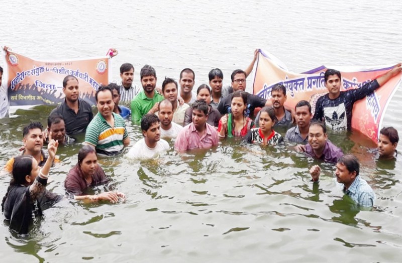 हरनाबांधा में किया हड़ताली कर्मचारियों ने जल सत्याग्रह