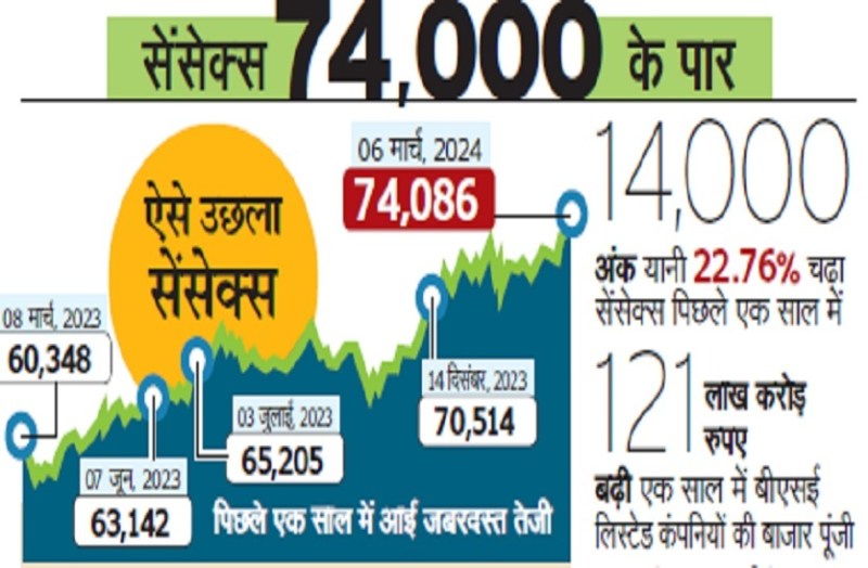मुंबई. फेड रिजर्व के अध्यक्ष जेरोम पॉवेल के अमरीकी संसद में होने वाले भाषण से पहले विश्व बाजार के मिलेजुले रुख के बीच स्थानीय स्तर पर बैंकिंग, आइटी और टेक समेत आठ समूहों में हुई लिवाली की बदौलत बुधवार को शेयर बाजार नए शिखर पर पहुंच गया। बीएसई का तीस शेयरों वाला सेंसेक्स 408.86 अंक अर्थात 0.55 प्रतिशत की छलांग लगाकर पहली बार 74 हजार अंक के मनोवैज्ञानिक स्तर के पार 74,085.99 अंक पर पहुंच गया। साथ ही नेशनल स्टॉक एक्सचेंज (एनएसई) का निफ्टी 117.75 अंक यानी 0.53 प्रतिशत उछलकर नए रिकॉर्ड स्तर 22,474.05 अंक पर रहा। हालांकि स्मॉल और मिड कैप शेयरों में हल्की गिरावट दर्ज की गई। स्मॉल कैप में 1.91 फीसदी और मिड कैप शेयर 0.6 फीसदी नीचे आए।