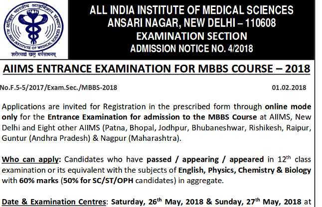 पुरे देशभर में 9 AIIMS संस्थानों, नई दिल्ली, पटना, भोपाल, जोधपुर , भुवनेश्वर, ऋषिकेश, रायपुर , गुंटूर (आंध्र प्रदेश) और नागपुर (महाराष्ट्र) में MBBS 2018 Exam कार्यक्रम में प्रवेश लेने की इच्छुक अभ्यर्थी को 5 मार्च 2018 से पहले आवेदन करना होगा । आधिकारिक नोटिफ़ातिओं के मुताबिक, प्रवेश परीक्षा 26 और 27 मई 2018 को पूरे देश में विभिन्न परीक्षा केंद्रों पर आयोजित की जाएगी।