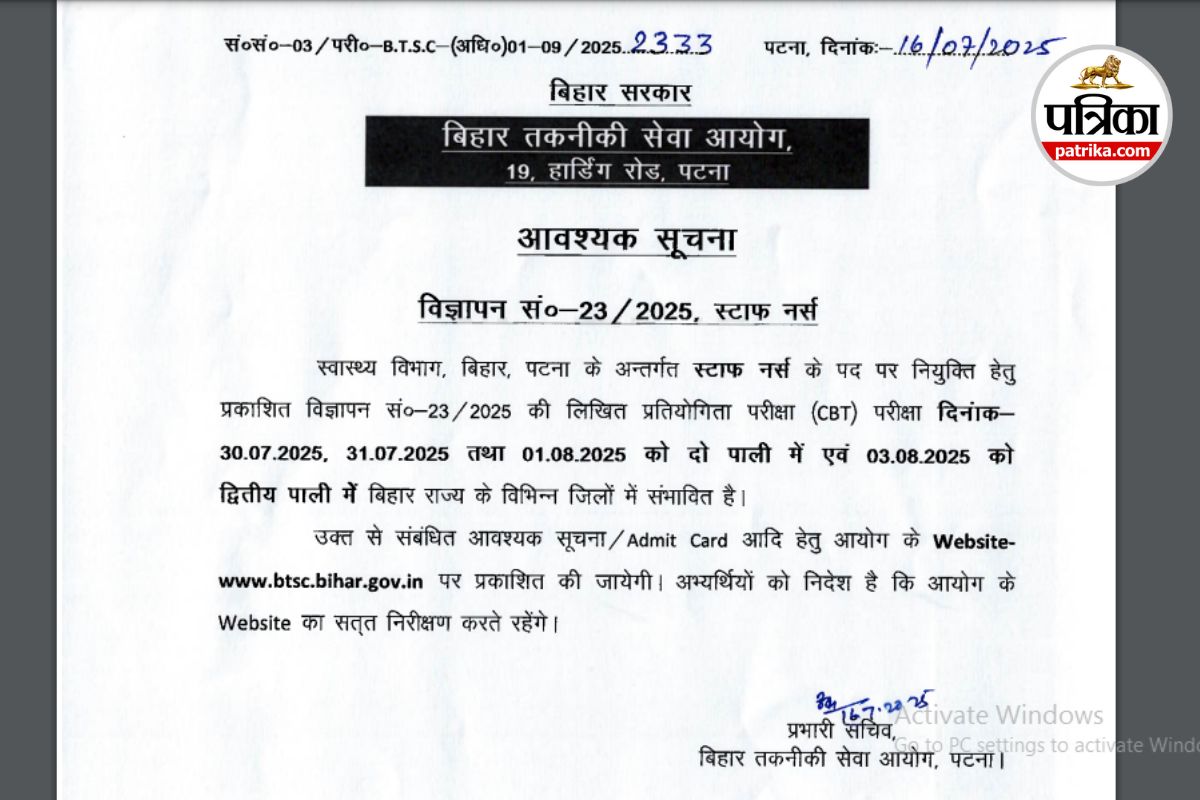 Bihar Staff Nurse Exam Date 2025: बिहार तकनीकी सेवा आयोग (BTSC) ने स्टाफ नर्स पदों पर होने वाली भर्ती परीक्षा की तारीखें जारी कर दी हैं। जिन उम्मीदवारों ने इस भर्ती के लिए आवेदन किया था, वे आयोग की आधिकारिक वेबसाइट btsc.bihar.gov.in पर जाकर परीक्षा कार्यक्रम देख सकते हैं। आयोग के मुताबिक, कंप्यूटर आधारित परीक्षा (CBT) का आयोजन 30 जुलाई, 31 जुलाई, 1 अगस्त और 3 अगस्त 2025 को किया जाएगा। परीक्षा दो पालियों में संपन्न होगी, जबकि 3 अगस्त को केवल दूसरी पाली में परीक्षा होगी। परीक्षा बिहार के विभिन्न जिलों में आयोजित की जाएगी। एडमिट कार्ड से संबंधित सूचना भी जल्द ही वेबसाइट पर जारी की जाएगी।