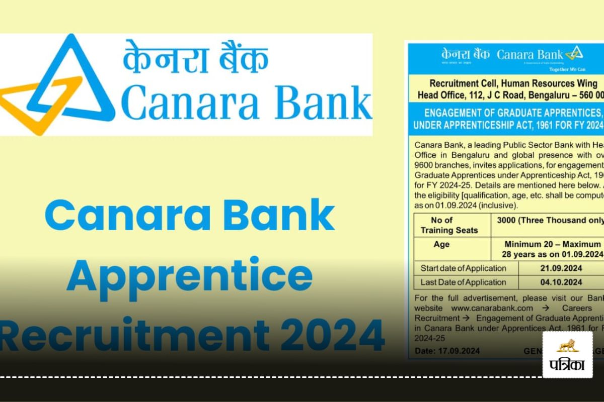 Canara Bank Apprentice Recruitment 2024 : बैंक की तैयारी कर रहे या बैंक में नौकरी पाने के इच्छुक युवाओं के लिए केनरा बैंक ने अपने दरवाजे खोल दिए हैं। केनरा बैंक ने अप्रेंटिस के पद के लिए हजारों पद पर वैकेंसी निकाली है। केनरा बैंक में नौकरी पाने के इच्छुक युवा इस वैकेंसी के लिए 21 सितंबर से ऑनलाइन आवेदन कर सकते हैं। ऑनलाइन आवेदन करने की अंतिम तारीख 4 अक्टूबर 2024 रखी गई है। जो भी उम्मीदवार इस भर्ती में शामिल होना चाहते हैं वो केनरा बैंक की आधिकारिक वेबसाइट canarabank.com पर जाकर ऑनलाइन आवेदन कर सकते हैं।