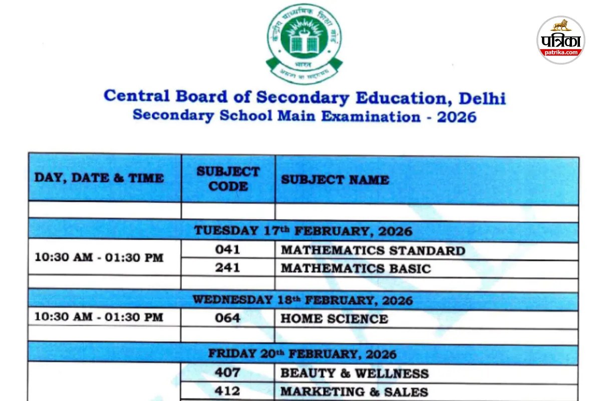 बोर्ड परीक्षा में शामिल होने वाले छात्र CBSE की आधिकारिक वेबसाइट cbse.gov.in पर जाकर पूरी डेटशीट देख सकते हैं। दी गई जानकारी के मुताबिक, कक्षा 10वीं की परीक्षाएं 10 मार्च 2026 को समाप्त होंगी, जबकि कक्षा 12वीं की परीक्षाएं 9 अप्रैल 2026 तक चलेंगी। परीक्षाएं हर दिन सुबह 10:30 बजे से दोपहर 1:30 बजे तक आयोजित की जाएंगी।
