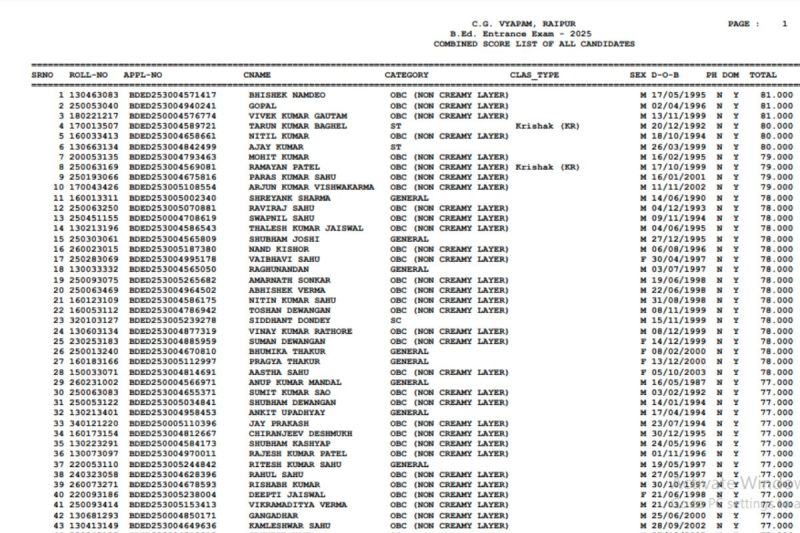 Chhattisgarh Pre B.Ed Exam 2025 Result: छत्तीसगढ़ व्यावसायिक परीक्षा मंडल (CG Vyapam) ने Chhattisgarh Pre B.Ed Exam 2025 Result घोषित कर दिया है। जिन उम्मीदवारों ने परीक्षा में हिस्सा लिया था, वे बोर्ड की आधिकारिक वेबसाइट vyapamcg.cgstate.gov.in पर जाकर अपना रिजल्ट चेक कर सकते हैं। साथ ही बोर्ड ने कंबाइंड मेरिट लिस्ट और फाइनल आंसर-की भी जारी कर दी है। परीक्षा का आयोजन 22 मई 2025 को हुआ था। यह परीक्षा दो पालियों में आयोजित की गई थी। सुबह की शिफ्ट में प्री बीएड और दोपहर की शिफ्ट में प्री डीएलएड परीक्षा संपन्न हुई थी। प्री बीएड परीक्षा सुबह 10:00 बजे से दोपहर 12:15 बजे तक आयोजित की गई थी। फिलहाल केवल प्री बीएड परीक्षा का परिणाम जारी किया गया है। प्री डीएलएड का रिजल्ट जल्द ही घोषित होने की संभावना है।