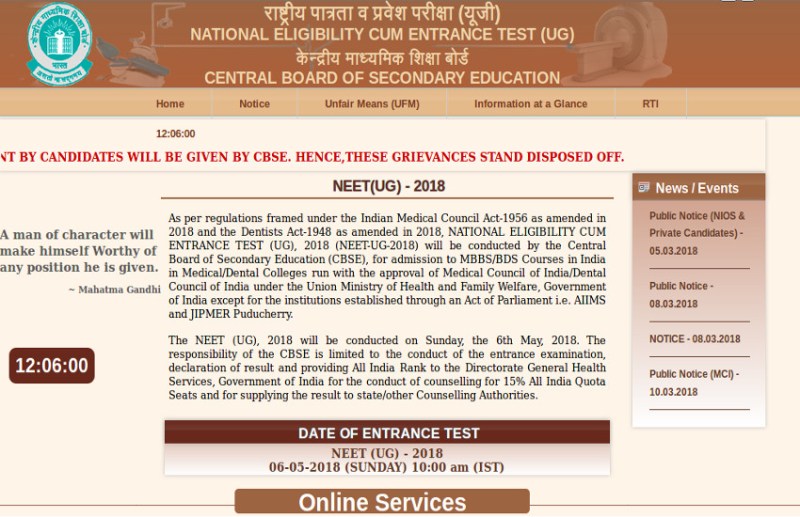 NEET UG 2018 Admit Card परीक्षा रविवार, 6 मई, 2018 को आयोजित किया जाएगा। पुरे देशभर के मेडिकल कॉलेज में प्रवेश के लिए एक ही परीक्षा द्वारा सीटों को भरा जाता है। जिन अभ्यर्थियों ने आवेदन किया है वो आधिकारिक वेबसाइट देखते रहें। नोटिफिकेशन और प्रवेश पत्र की आधिकारिक जानकारी के लिए https://cbseneet.nic.in/ पर देखते रहें।