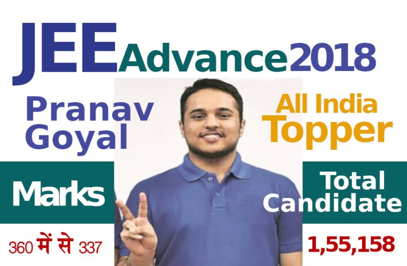 जॉइंट एंट्रेंस एग्जामिनेशन (जेईई) IIT jee advanced result 2018 का परिणाम रविवार को किया गया। रुडक़ी जोन से प्रणव गोयल ने ऑल इंडिया फर्स्ट रैंक हासिल की है। पंचकुला के रहने वाले प्रणव को 360 में से कुल 337 अंक प्राप्त हुए हैं। वहीं ऑल इंडिया रैंकिंग में दूसरे स्थान पर कोटा के साहिल जैन और तीसरे स्थान पर दिल्ली के कैलाश गुप्ता रहे। मीनल पारेख ने लड़कियों में टॉप किया है। मीनल की ऑल इंडिया रैंक 6 है। कोटा की मीनल को 360 में से 318 अंक मिले हैं। आईआईटी खडग़पुर रीजन से के वी आर हेमंत कुमार चोडीपिल्ली ने टॉप किया है। उनकी ऑल इंडिया रैंक 7वीं है। इसी तरह आईआईटी खडग़पुर से गर्ल्स में विनीता वेन्नेला ने लड़कियों में टॉप किया है। उनकी ऑल इंडिया रैंक २६१ बनी है। स्टूडेंट्स अपना रिजल्ट जेईई की आधिकारिक वेबसाइट jeeadv.ac.in पर देख सकते हैं।