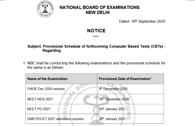 NEET 2021 Exam Schedule : नेशनल बोर्ड ऑफ एग्जामिनेशन (NBE) ने आगामी पात्रता परीक्षा के लिए प्रोवीजनल शेड्यूल की घोषणा की है, जिसमें राष्ट्रीय पात्रता सह प्रवेश परीक्षा स्नातकोत्तर (NEET - PG 2021), NEET MDS 2021, विदेशी मेडिकल स्नातक परीक्षा (FMGE 2020), DNB पोस्ट डिप्लोमा सेंट्रलाइज्ड एंट्रेंस टेस्ट (DNBET 2021) शामिल हैं. प्रोवीजनल शेड्यूल के अनुसार, NEET-PG 2021, 10 जनवरी को आयोजित किया जाएगा। वहीं, NEET-MDS 2021, 16 दिसंबर को आयोजित किया जाएगा। पीएमजीई दिसंबर 2020 सत्र परीक्षा 4 दिसंबर को आयोजित की जाएगी, जबकि डीएनबी पीडीसीईटी 2021 प्रवेश सत्र 28 जनवरी, 2021 को आयोजित किया जाएगा।