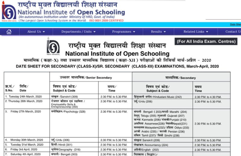 NIOS Board Exams Date Sheet 2020: नैशनल इंस्टिट्यूट ऑफ ओपन स्कूलिंग ने बोर्ड परीक्षाओं का कार्यक्रम जारी कर दिया है। 10वीं और 12वीं कक्षा की मार्च-अप्रैल महीने में आयोजित होने वाली परीक्षा का कार्यक्रम जारी कर दिया गया है। एनआईओएस ने भारतीय और विदेशी विद्यार्थियों के लिए अलग-अलग डेटशीट जारी की है। परीक्षा 24 मार्च से शुरू होगी और 24 अप्रैल, 2020 को समाप्त होगी।