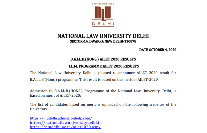 NLU AILET 2020 Result : नेशनल लॉ यूनिवर्सिटी (NLU) दिल्ली ने ऑल इंडिया लॉ एंट्रेंस टेस्ट (AILET) के नतीजे जारी कर दिए हैं। जो उम्मीदवार परीक्षा में उपस्थित हुए थे, वे अपना स्कोर कार्ड आधिकारिक वेबसाइट- nludelhi.ac.in से डाउनलोड कर सकते हैं।