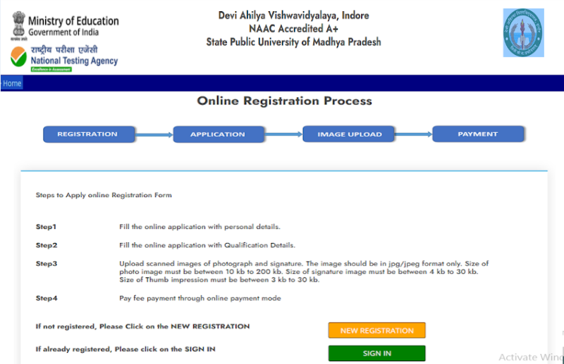 रजिस्ट्रेशन करने के लिए सबसे पहले आधिकारिक वेबसाइट davv.nta.ac.in पर जाएं। इसके बाद होम पेज पर दिए गए डीएवीवी 2021 पंजीकरण के बारे में पढ़ने वाले लिंक पर क्लिक करें। आगे की टैब में उम्मीदवार यूजी लिंक या पीजी लिंक चुन सकते हैं, जो उस परीक्षा पर निर्भर करता है जो वे देना चाहते हैं।पाठ्यक्रम का चयन करने पर एक नया पेज खुलेगा। जिसमें रजिस्ट्रेशन और 'साइन इन' के विकल्प दिए होंगे। यहाँ न्यू यूजर रजिस्ट्रेशन और रजिस्टर्ड यूजर साइन इन पर क्लिक करें। इसके बाद जो फॉर्म ओपन हो, उसमें मांगी गई जानकारी सही से भरकर सबमिट कर दें। अगले चरण में आवेदन शुल्क का भुगतान करें और फाइनल सबमिशन कर दें। पूर्ण भरे हुए आवेदन का प्रिंट जरूर लेवें।