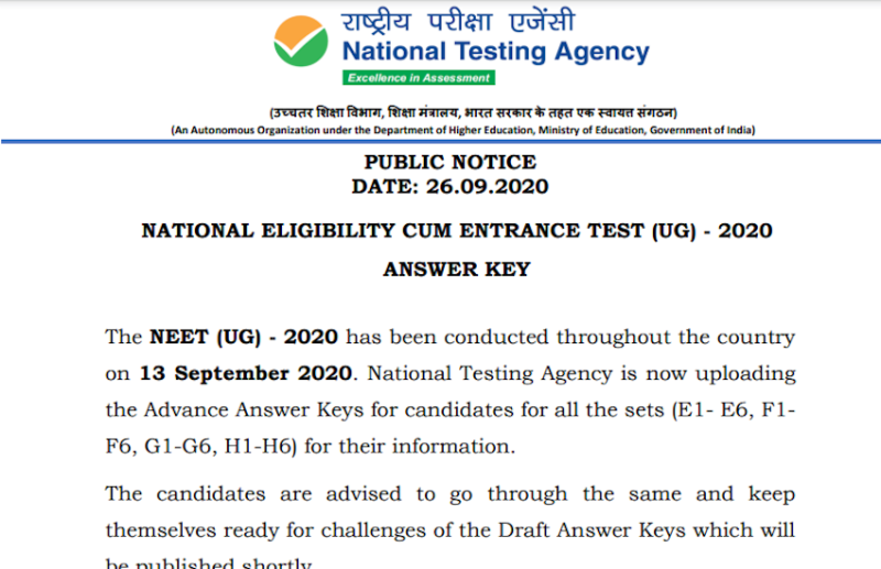 केंद्रीय शिक्षा मंत्री रमेश पोखरियाल निशंक ने 14 सितंबर को ट्वीट कर बताया था कि नीट में पंजीकृत कुल 15.97 छात्रों में से 14.37 लाख छात्रों ने परीक्षा दी। आंसर-की जारी होने पर उन्हें उत्तरों के प्रति आपत्ति दर्ज कराने का मौका भी दिया जाएगा।