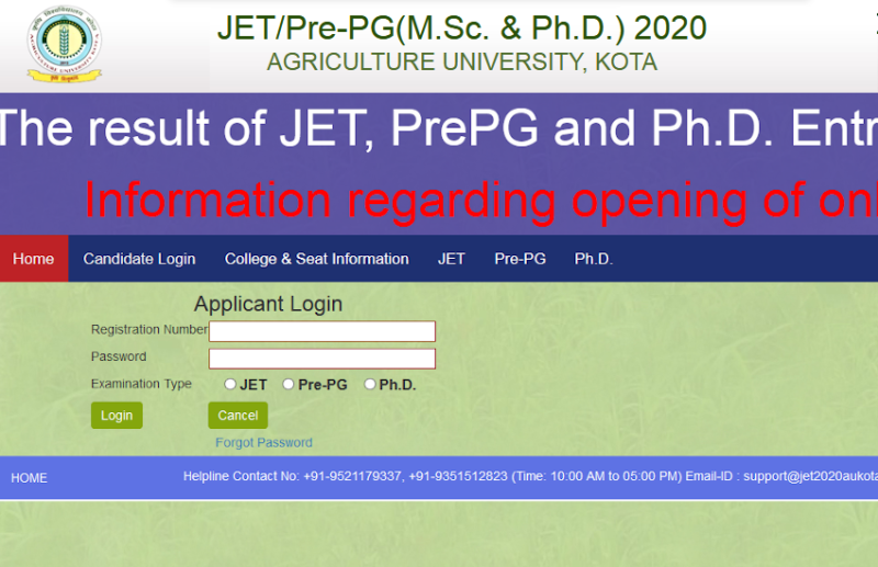Rajasthan JET Result 2020: कृषि विश्वविद्यालय, कोटा ने राजस्थान संयुक्त प्रवेश परीक्षा (JET) के परिणाम जारी कर दिए हैं। उम्मीदवार जो संयुक्त प्रवेश परीक्षा 2020 के लिए उपस्थित हुए थे, वे आधिकारिक वेबसाइट - jet2020aukota.com पर अपने परिणाम चेक कर सकते हैं। उम्मीदवार अपने राजस्थान जेईटी परिणाम नीचे दिए गए डाइरेक्ट लिंक से भी देख सकते हैं।