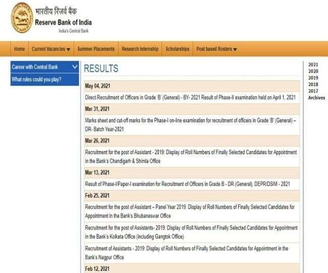 RBI Grade B Phase 2 Result 2021: रिजर्व बैंक ऑफ इंडिया (RBI) ने आज यानि की 4 मई2021 को ऑफिसर ग्रेड- बी, फेज 2 परीक्षा 2021 के नतीजे घोषित कर दिए हैं। जिन उम्मीदवारों ने ग्रेड 'बी' (डीआर)- जनरल के फेज 2 परीक्षा में शामिल हुए थे वे लोग अपने परिणाम जानने के लिए ऑफिशियल वेबसाइट opportunities.rbi.org.in पर जाएं। इसके साथ ही इसमें इंटरव्यू के लिए शॉर्टलिस्ट किए गए उम्मीदवारों की सूची पर अपडेट है। उम्मीदवार, अपने रोल नंबर के अनुसार इसकी जांच कर सकते हैं।
