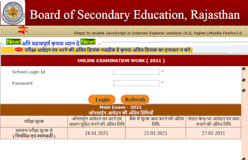 RBSE Board Exam Form 2021: राजस्थान माध्यमिक शिक्षा बोर्ड की 10वीं और 12वीं सत्रांत परीक्षा- 2021 के लिए आवेदन का आज अंतिम दिन है। ऐसे में जिन विद्यार्थियों ने अभी तक आवेदन नहीं किया है, वे अभी अप्लाई करें। आरबीएसई ऑनलाइन एप्लीकेशन विंडो आज बंद होगी। बता दें कि राजस्थान बोर्ड ने इसके पहले 10वीं और 12वीं बोर्ड परीक्षा के लिए ऑनलाइन एप्लीकेशन फॉर्म भरने की अंतिम तिथि 8 जनवरी निर्धारित की थी, जिसे आगे बढ़ा कर 18 जनवरी किया गया था। आवेदन करने के लिए बोर्ड की आधिकारिक वेबसाइट http://rajeduboard.rajasthan.gov.in/ पर जा सकते हैं।