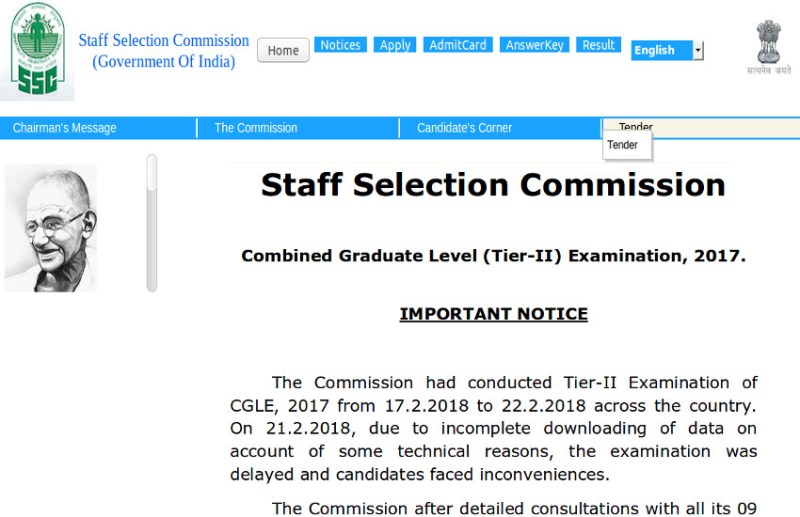 कर्मचारी चयन आयोग ने पूरे देश में 17.2.2018 से 22.2.2018 तक CGL, 2017 की टियर -2 परीक्षा आयोजित की थी। 21.2.2018 को, कुछ तकनीकी कारणों के कारण डेटा के अधूरे डाउनलोड होने के कारण, परीक्षा में देरी हुई और उम्मीदवारों को असुविधाओं का सामना करना पड़ा। आयोग अपने सभी 09 क्षेत्रीय / उप-क्षेत्रीय कार्यालयों के साथ विस्तृत जानकारी के बाद और उनके द्वारा प्रदान किए गए इनपुट के आधार पर और भी कुछ उम्मीदवारों से प्राप्त अभ्यावेदन, आयोग ने उम्मीदवारों के हित में एक निर्णय लिया है, जो पेपर-आई अर्थात मात्रात्मक योग्यता को 9.3.2018 को 10.30 बजे के पुन: संचालन के लिए किया गया है। का विवरण